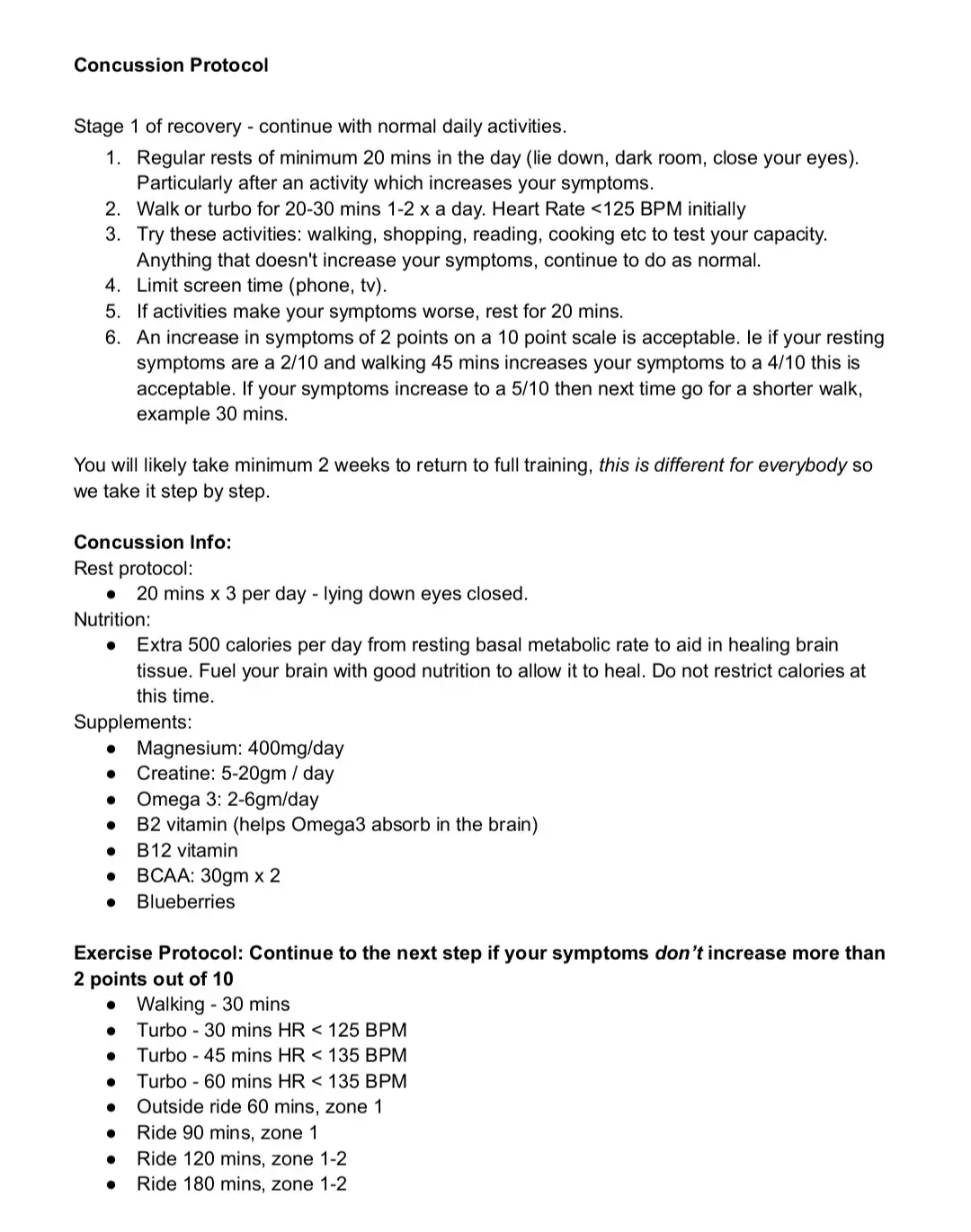 I hit 12 weeks and my symptoms were lower than they had been but not low enough to get to step 2 on the protocol without issue. My physio had been great, but at 12 weeks she did tell me I needed to seek out help from a doctor as we were now entering post concussion syndrome territory. I did this, we had a follow up MRI etc. but one of the best things I had done in the 12 weeks was talk to different endurance athletes who had suffered concussion or TBI’s and ask them what they had experienced.